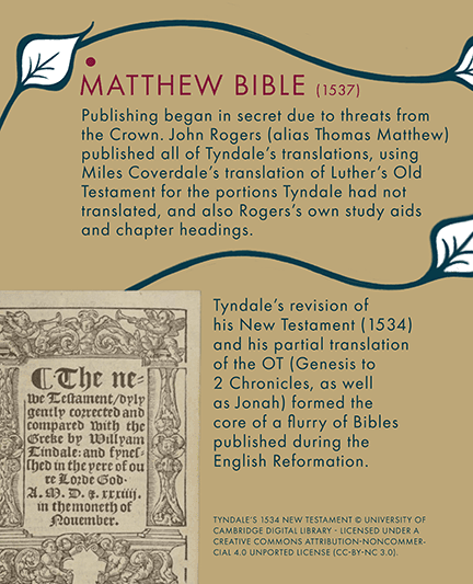 William Tyndale (1494–1536) was a pioneering translator of the Bible whose work continues to shape the way it is read today. Tyndale was the first to translate the New Testament into English directly from the original Greek. His clear and memorable English style became the foundation for subsequent English translations, and his influences can be seen throughout the King James Bible of 1611.